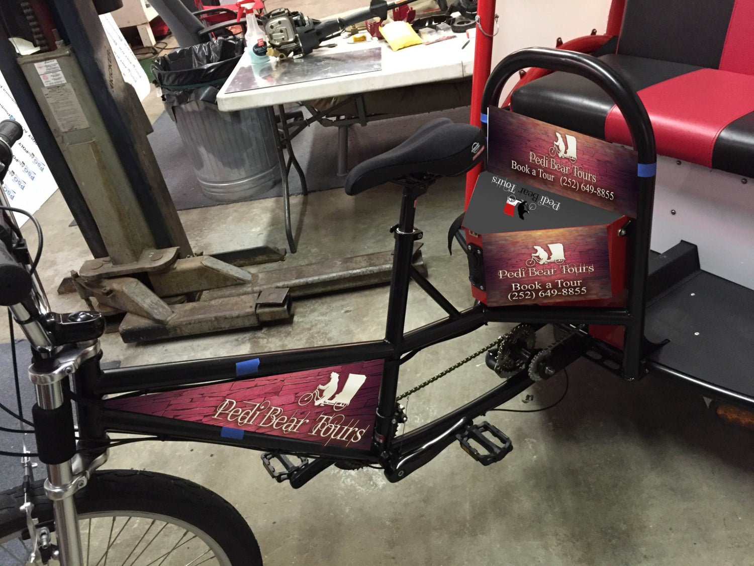These are vinyl advertisements that cover the entire brandable surface of the pedicab. This is the most attractive and most popular option. (Durable up to 6 months)